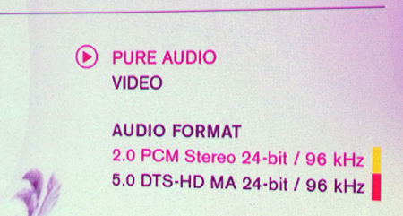 「PURE AUDIO」は、2chが「PCM 24bit/96kHz」、5.0サラウンドは「DTS-HD MA 24bit/96kHz」。