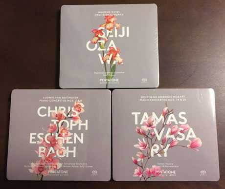 ドイツ・グラモフォンの4チャンネル録音をSACDで昨年発売になった、ペンタトーンの〈リマスター・クラシック〉シリーズは、ドイツ・グラモフォンの4チャンネル録音から、ペンタトーンがマルチチャンネルを製作した期待のSACDでした。 本作は、今では指揮者としての活動の方が多いクリストフ・エッシェンバッハのピアノで、ベートーヴェンのピアノ協奏曲の第5番〈皇帝〉と第3番を収録しています。どちらもグラモフォンの名盤でしたが、4チャンネル録音があったとは驚きでした。オリジナルは別々のLPでしたが、SACDは1枚に収録。 ![]() このレビューは左下のSACD。ちなみに上が『ラベル:オーケストラ作品集〜クープランの墓、マ・メール・ロワほか』小澤征爾指揮ボストン交響楽団、右下がモーツァルト:ピアノ協奏曲第26番「戴冠式」第14番 タマーシュ・ヴァーシャリ(ピアノ指揮) 目の前に置かれた寿司のように迫るフロント当然マルチチャンネルで聴いてみました。当時の4チャンネルですから、センター・スピーカーに音はありません。 1973年録音とあって、アナログ時代特有の重厚さ。フロントにはピアノがガッツリと立体感を持ってあらわれます。 これを寿司屋の寿司にたとえるなら、2chがカウンターの上の段に置かれた寿司だとしたら、マルチチャンネルは目の前に「ドーン」と出された寿司。手に取るように立体感のある寿司、じゃなくて音場が目の前にあらわれます。 フロントがこうですから、リアのアンビエント音さえも、現在のサラウンド録音の透明度のあるリア音と比べて「コッテリ感」が感じられます。リスニングの位置からリアスピーカに顔を向けると「お、音入っている」と自覚できるほどでした。 通俗に思っていた〈皇帝〉もハマる、エッシェンバッハのピアノとマルチチャンネルの音場この音場で、エッシェンバッハの〈皇帝〉第1楽章、例のピアノのカデンツァが、トルルルと華やかな音で登場するのですからたまりません。キラキラと輝くピアノが駆け巡ります。 実のところ、クラシック通になるほど、ベートーヴェンのピアノ協奏曲は、この〈皇帝〉が通俗に思えてきて、第3番、第4番の内省的なほうを好むようになると思うのですが(そんなことないですか?)、このエッシェンバッハの〈皇帝〉は、いいですねえ。あふれんばかりの喜びが、オーディオ音になって伝わってきます。 その一方で〈皇帝〉の第2楽章や、第3番の同じく第2楽章では、詩情あふれる演奏で、それにもエッシェンバッハは魅了します。実のところ、ドイツ・グラモフォンのサラウンドが目当てで買ったSACDですが、この〈皇帝〉と第3番はいい演奏だと思った次第です。 サラウンド良し、演奏良しが期待できる〈リマスター・クラシック〉シリーズ、今後も期待が高まります。 |